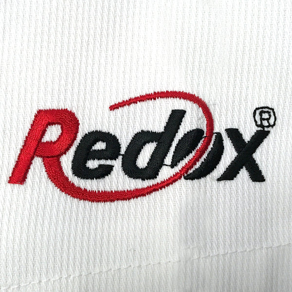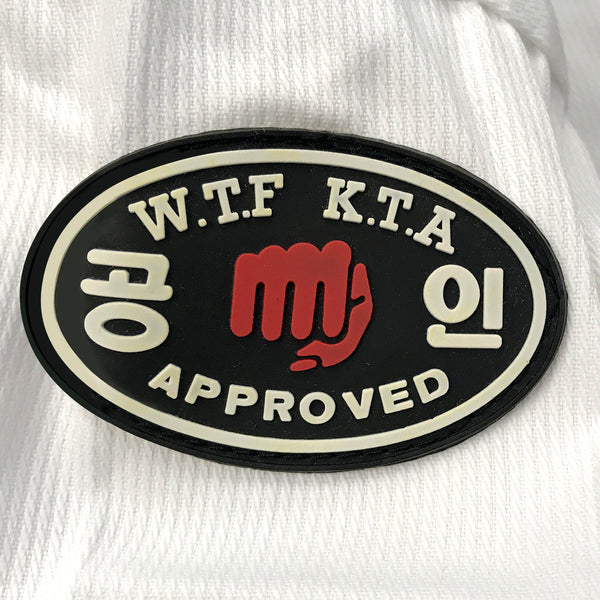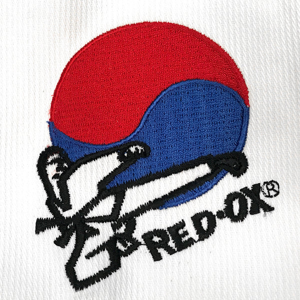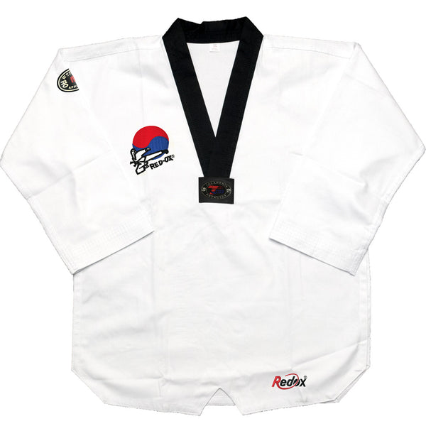 55% Cotton / 45% Polyester. Taeguk mark with kicking guy embroidered on the right chest. W.T.F. & K.T.A. Approved "공인" rubber patch on right arm. Redox embroidered logo on top...